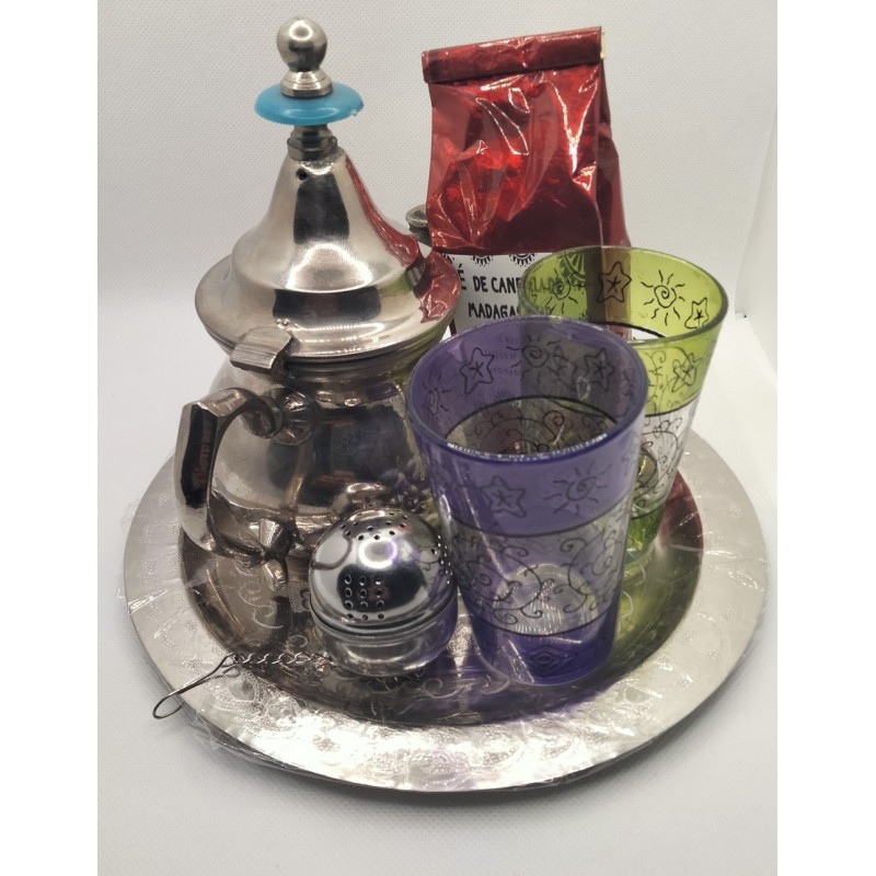 Disfruta de la auténtica experiencia del té marroquí con este completo set de tetera y bandeja de alpaca. Fabricado con materiales de alta calidad y con un diseño tradicional marroquí, este set es perfecto para preparar y servir té de forma elegante y auténtica.
