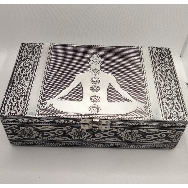 Este joyero artesanal único, fabricado en madera forrado por alpaca repujada de alta calidad y con un diseño rectangular elegante, es el lugar perfecto para guardar tus preciadas joyas . El grabado de un yogui en meditación y los chakras te inspirarán a seguir tu camino espiritual.