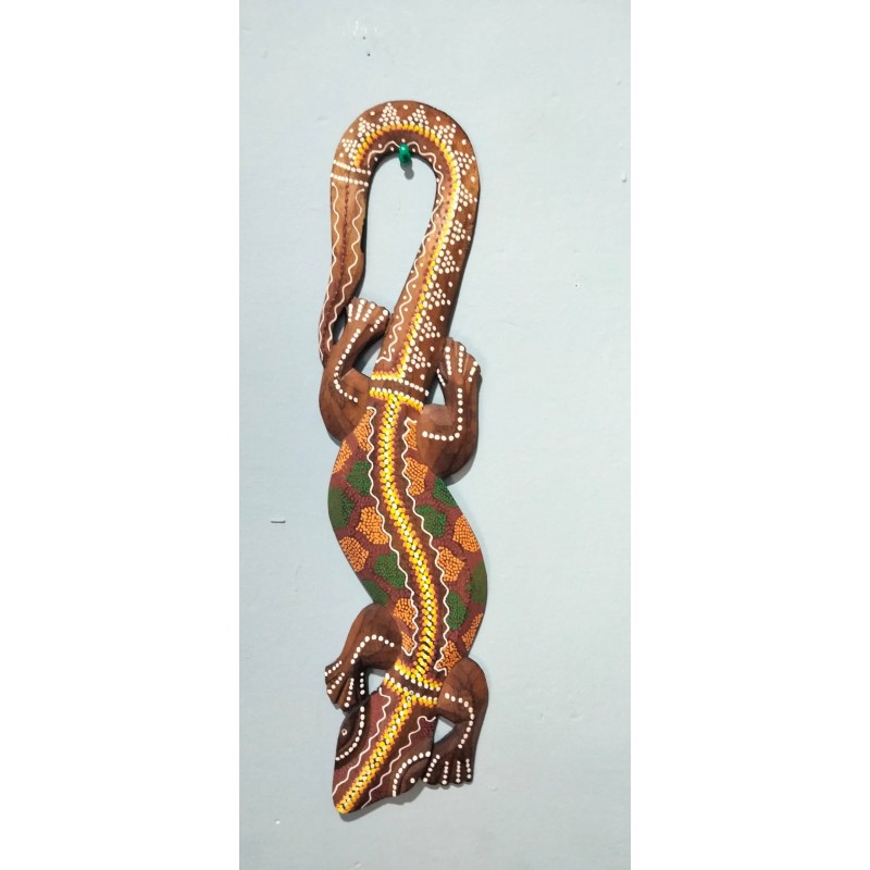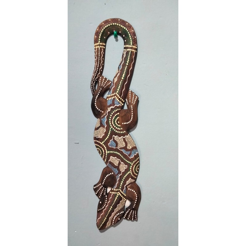 Lagartos simbolizan en diversas culturas la tierra y la abundancia.figura hecha de madera pintada a mano .origen indonesia.medida 50*11 cm.hay varios colores se mandará las que haya en el stock.