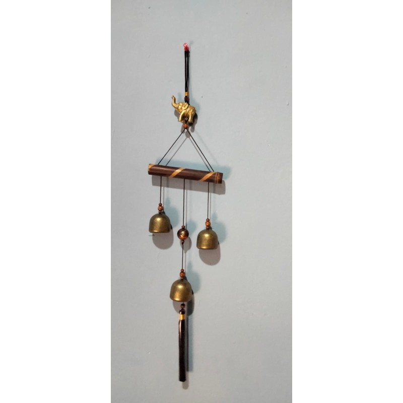 Móvil metálico pequeño con 3 campanas de sonido agradable.contiene el símbolo de la resistencia y inteligencia (el elefante).medida 60 cm.