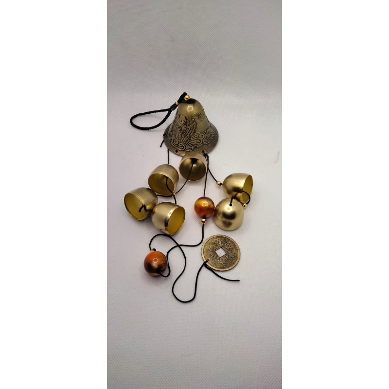 Móvil metálico mediano con 6 campanas.contiene el símbolo de fuerza y energía (el dragón) y el símbolo de valentía y inspiración espiritual ( el águila). Medida 56cm.