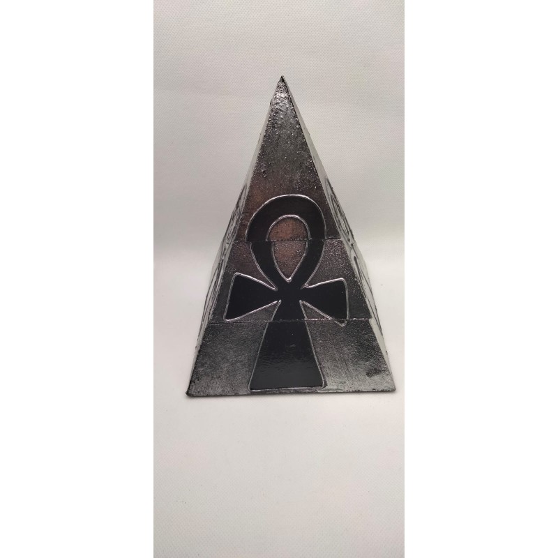 Pirámide joyero pequeño,hecho de madera pintada a mano.contiene dos cavidades.las pirámides simbolizan el inicio del viaje al más allá (construidas a partir de la piedra BenBen que representaba los rayos de sol en las cual viajaba el alma del difunto faraón) y la cruz de vida que significaba la existencia mortal como la vida en el más allá.