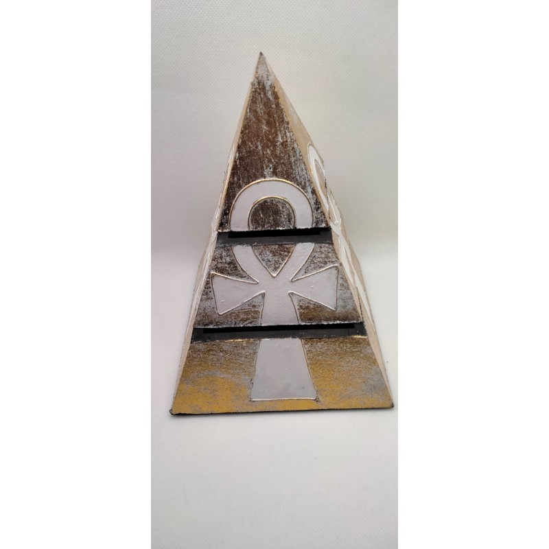 Pirámide joyero pequeño hecho de madera pintada a mano con técnicas ancestrales.contiene dos cavidades.