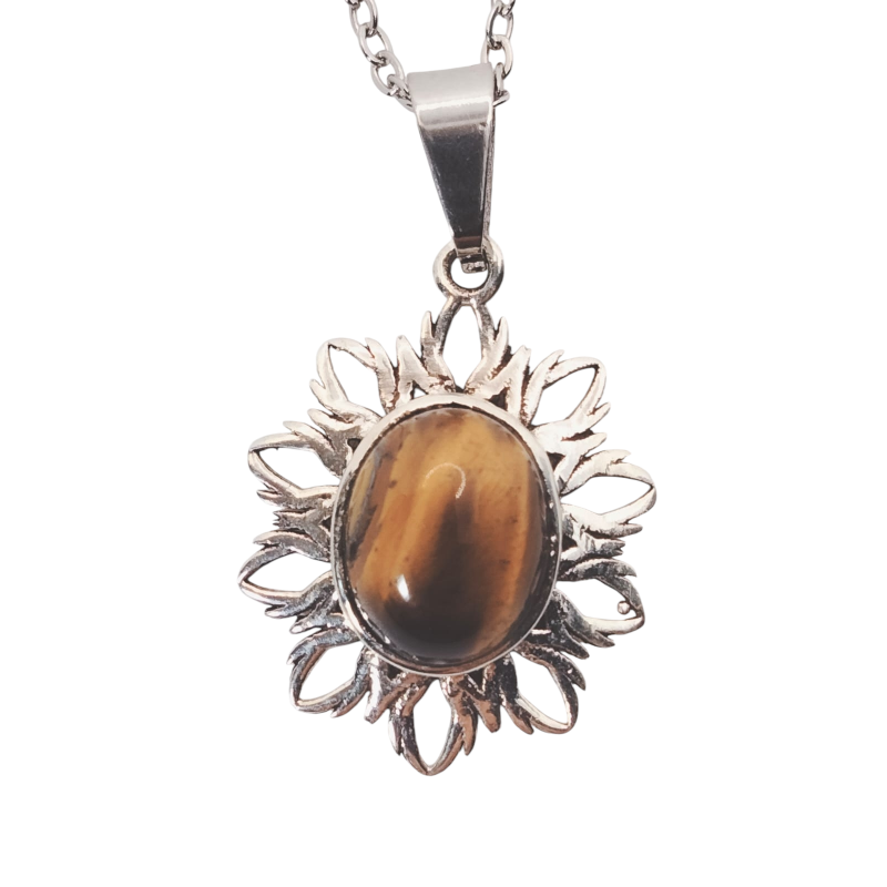 Colgante ojo de tigre montado en plata ley y incluye la cadena de plata con opción de elegir la medida entre 40 cm y 45 cm.