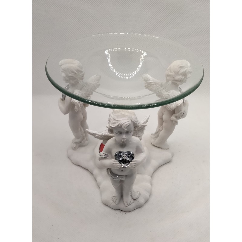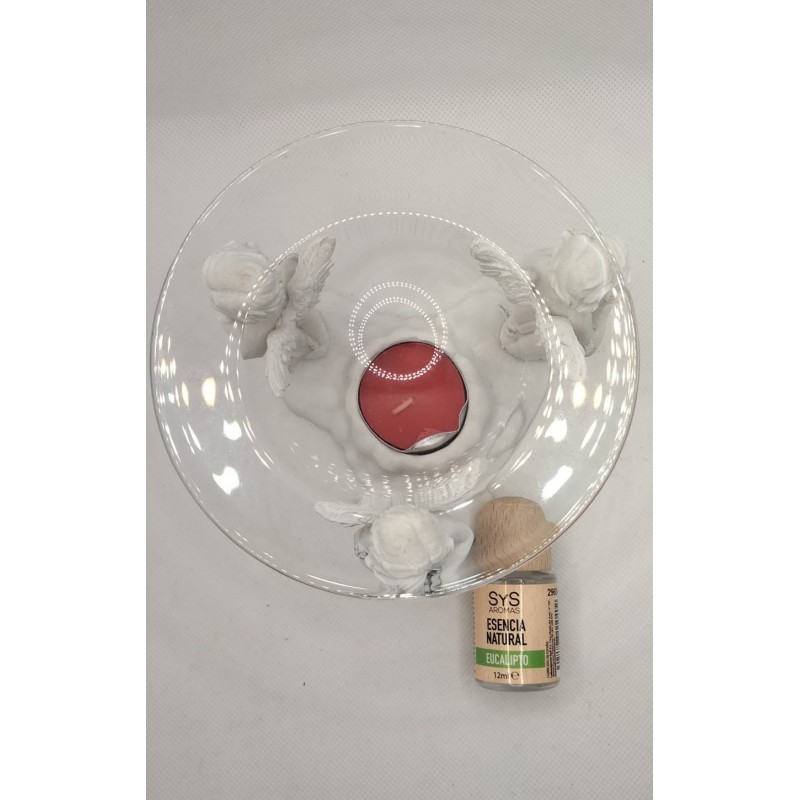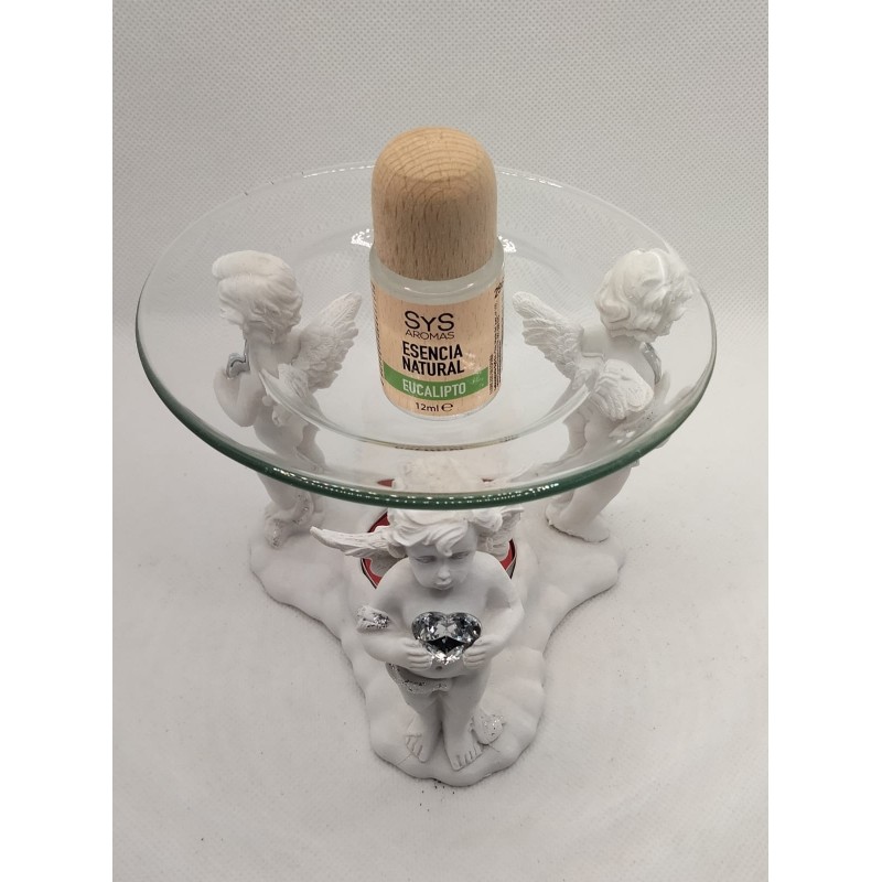 Es una base de resina blanca ( se puede pintar) y un plato de cristal resistente al calor, es especial para quemar aceites o esencias naturales .incluye 2 velitas).