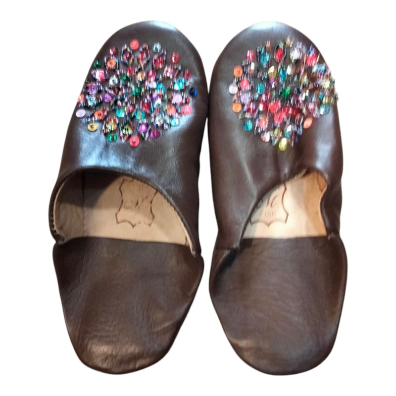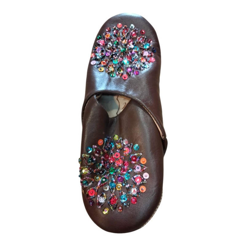 Hecha del auténtico cuero de marruecos y adornada de lentejuelas de colores.