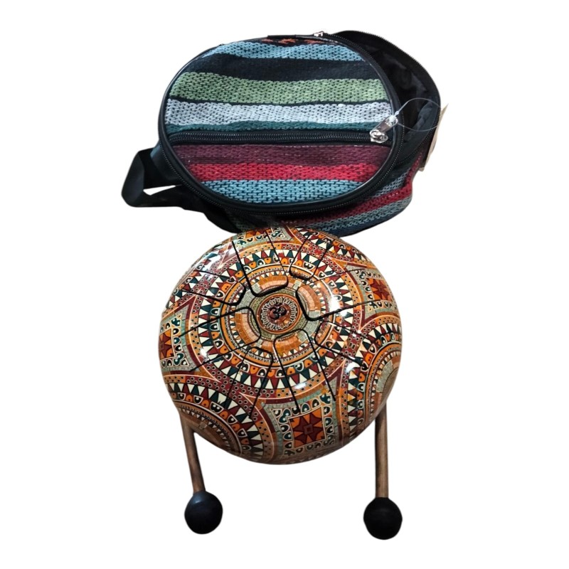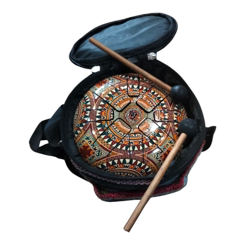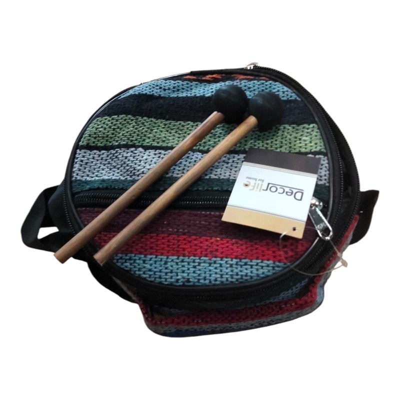 Tambor de lengüeta, original de India, con símbolo Om y mandalas. Ideal para meditación y sanación sonora. Incluye estuche ( bolso) y dos mazos ; su sonido profundo conecta cuerpo y alma.