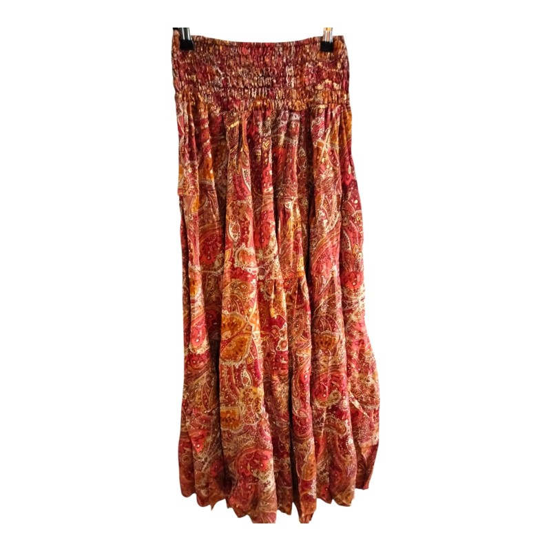 Falda de seda India, elegancia y movimiento en cada paso. Hecha con el 70% pura y detalles artesanales únicos.ideal para lucir un estilo bohemio, fresco y sofisticado.