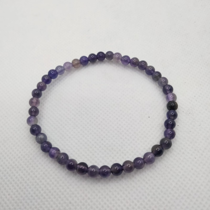 Pulsera con amatista natural, un cuarzo de tono violeta intenso, brillo vítreo y dureza 7 en la escala de mohs. Su color característico proviene del hierro presente en su estructura Cristina, ofreciendo una pieza elegante, resistente y llena de serenidad. Representa la intuición porque se posiciona en el tercer punto de las siete chakras.