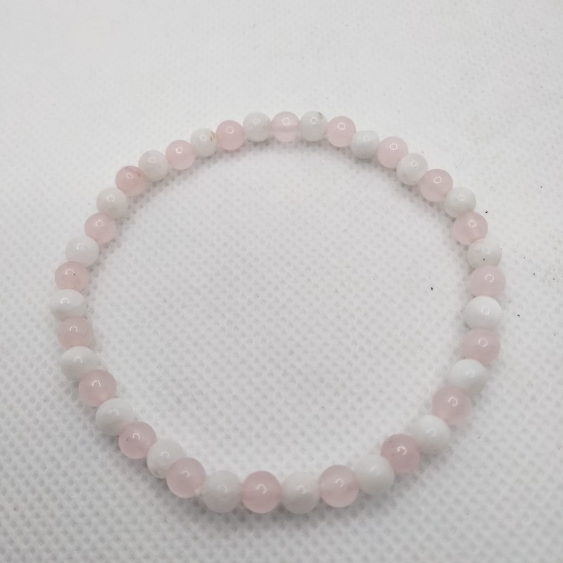 Pulsera elaborada con piedra luna natural, conocida por su delicado efecto fluorescencia, un brillo nacarado que cambia con la luz. Este mineral pertenece al grupo de los feldespato, con dureza 6-6,5 y tonos que van del blanco perlado al azul suave. Combinado con cuarzo rosa símbolo de amor y cariño. Son piezas luminosas, elegantes y perfectas para quienes buscan un toque sutil y mágico en su estilo.