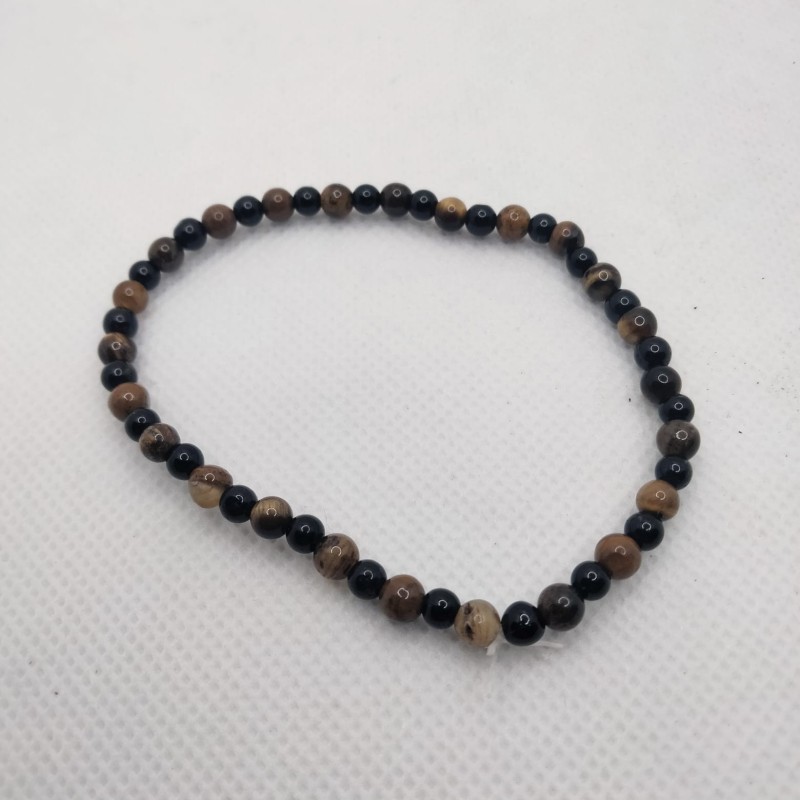 Pulsera combinado de turmalina negra, conocida por su resistencia, brillo opaco y efecto ionizante, junto a ojo de tigre.